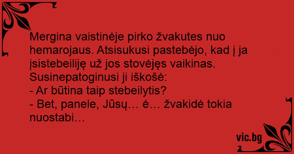 Mergina vaistinėje pirko žvakutes nuo hemarojaus. Atsisukusi pastebėjo, kad į ja įsistebeiliję už jos stovėjęs vaikinas. Susinepatoginusi ji iškošė: