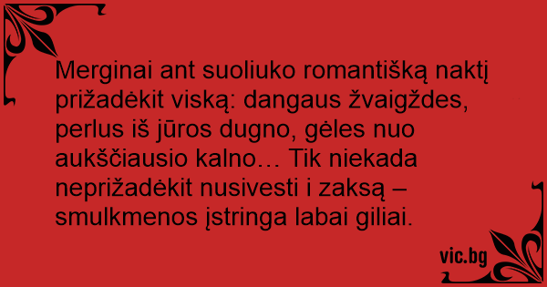 Merginai ant suoliuko romantišką naktį prižadėkit viską: dangaus žvaigždes, perlus iš jūros dugno, gėles nuo aukščiausio kalno… Tik niekada neprižadėkit nusivesti i zaksą – smulkmenos įstringa labai giliai.