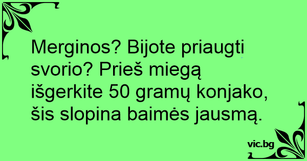 Merginos? Bijote priaugti svorio? Prieš miegą išgerkite 50 gramų konjako, šis slopina baimės jausmą.