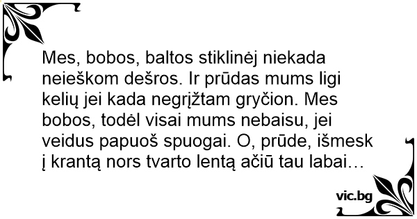 Mes, bobos, baltos stiklinėj niekada neieškom dešros. Ir prūdas mums ligi kelių jei kada negrįžtam gryčion. Mes bobos, todėl visai mums nebaisu, jei veidus papuoš spuogai. O, prūde, išmesk į krantą nors tvarto lentą ačiū tau labai…