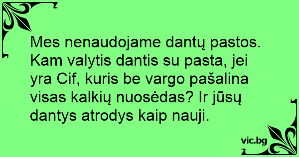 Mes nenaudojame dantų pastos. Kam valytis dantis su pasta, jei yra Cif, kuris be vargo pašalina visas kalkių nuosėdas? Ir jūsų dantys atrodys kaip nauji.