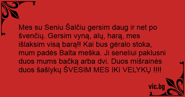 Mes su Seniu Šalčiu gersim daug ir net po švenčių. Gersim vyną, alų, harą, mes išlaksim visą barą!! Kai bus gėralo stoka, mum padės Balta meška. Ji seneliui paklusni duos mums bačką arba dvi. Duos mišrainės duos šašlykų ŠVESIM MES IKI VELYKŲ !!!!