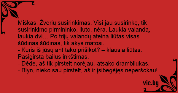 Miškas. Žvėrių susirinkimas. Visi jau susirinkę, tik susirinkimo pirmininko, liūto, nėra. Laukia valandą, laukia dvi… Po trijų valandų ateina liūtas visas šūdinas šūdinas, tik akys matosi.