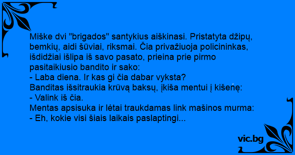 Miške dvi "brigados" santykius aiškinasi. Pristatyta džipų, bemkių, aidi šūviai, riksmai. Čia privažiuoja policininkas, išdidžiai išlipa iš savo pasato, prieina prie pirmo pasitaikiusio bandito ir sako: