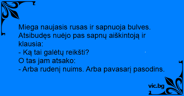 Miega naujasis rusas ir sapnuoja bulves. Atsibudęs nuėjo pas sapnų aiškintoją ir klausia: