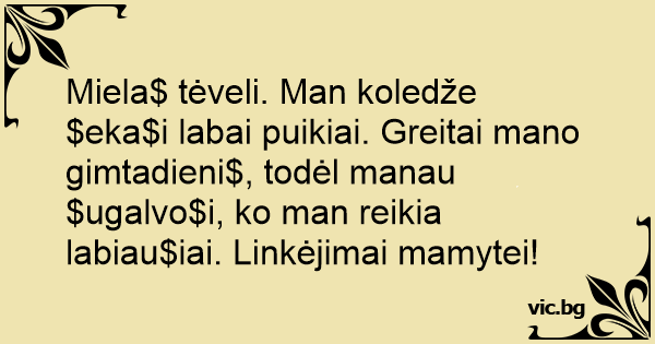 Miela$ tėveli. Man koledže $eka$i labai puikiai. Greitai mano gimtadieni$, todėl manau $ugalvo$i, ko man reikia labiau$iai. Linkėjimai mamytei!