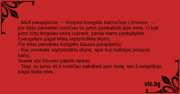 - Mieli parapijiečiai, — kreipėsi kunigėlis bažnyčioje į žmones, — per kitas pamaldas norėčiau su jumis pasikalbėti apie melą. O kad jums būtų lengviau viską suprasti, parėję namo paskaitykite Evangelijos pagal Matą septynioliktą skyrių.