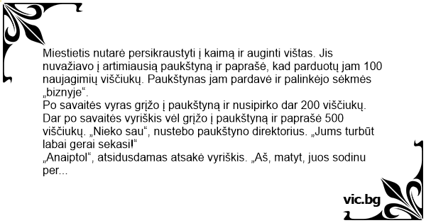 Miestietis nutarė persikraustyti į kaimą ir auginti vištas. Jis nuvažiavo į artimiausią paukštyną ir paprašė, kad parduotų jam 100 naujagimių viščiukų. Paukštynas jam pardavė ir palinkėjo sėkmės „biznyje“.