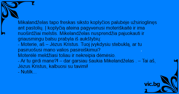 Mikalandželas tapo freskas siksto koplyčios palubėje užsirioglinęs ant pastolių. Į koplyčią ateina pagyvenusi moteriškaitė ir ima nuoširdžiai melstis. Mikelandželas nusprendžia pajuokauti ir griausmingu balsu prabyla iš aukštybių: