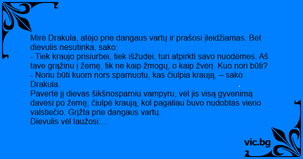 Mirė Drakula, atėjo prie dangaus vartų ir prašosi įleidžiamas. Bet dievulis nesutinka, sako: