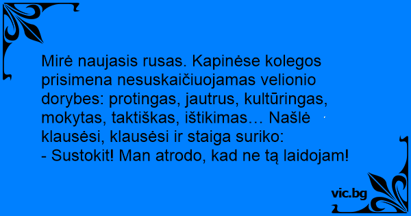 Mirė naujasis rusas. Kapinėse kolegos prisimena nesuskaičiuojamas velionio dorybes: protingas, jautrus, kultūringas, mokytas, taktiškas, ištikimas… Našlė klausėsi, klausėsi ir staiga suriko: