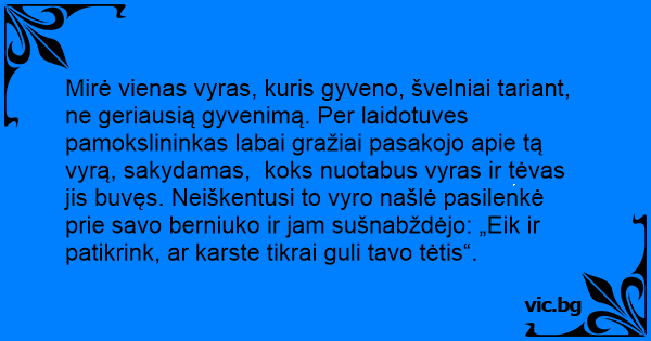 Mirė vienas vyras, kuris gyveno, švelniai tariant, ne geriausią gyvenimą. Per laidotuves pamokslininkas labai gražiai pasakojo apie tą vyrą, sakydamas, koks nuotabus vyras ir tėvas jis buvęs. Neiškentusi to vyro našlė pasilenkė prie savo berniuko ir jam sušnabždėjo: „Eik ir patikrink, ar karste tikrai guli tavo tėtis“.