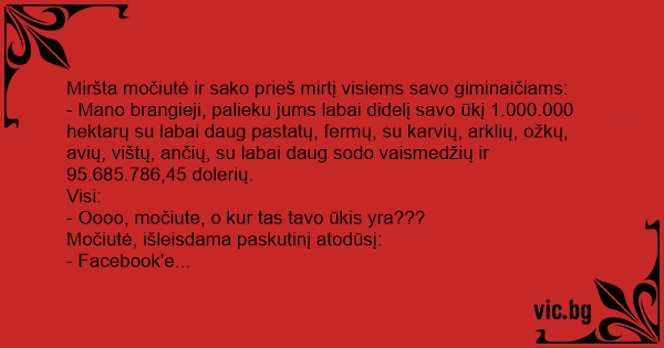 - Mano brangieji, palieku jums labai didelį savo ūkį 1.000.000 hektarų su labai daug pastatų, fermų, su karvių, arklių, ožkų, avių, vištų, ančių, su labai daug sodo vaismedžių ir 95.685.786,45 dolerių.