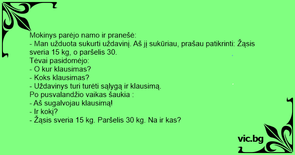 - Man užduota sukurti uždavinį. Aš jį sukūriau, prašau patikrinti: Žąsis sveria 15 kg, o paršelis 30.