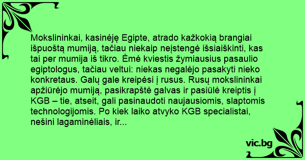Mokslininkai, kasinėję Egipte, atrado kažkokią brangiai išpuoštą mumiją, tačiau niekaip neįstengė išsiaiškinti, kas tai per mumija iš tikro. Ėmė kviestis žymiausius pasaulio egiptologus, tačiau veltui: niekas negalėjo pasakyti nieko konkretaus. Galų gale kreipėsi į rusus. Rusų mokslininkai apžiūrėjo mumiją, pasikrapštė galvas ir pasiūlė kreiptis į KGB – tie, atseit, gali pasinaudoti naujausiomis, slaptomis technologijomis. Po kiek laiko atvyko KGB specialistai, nešini lagaminėliais, ir paprašė palikti juos su mumija vienus. Praėjus valandai, KGB specialistai išėjo ir tarė: