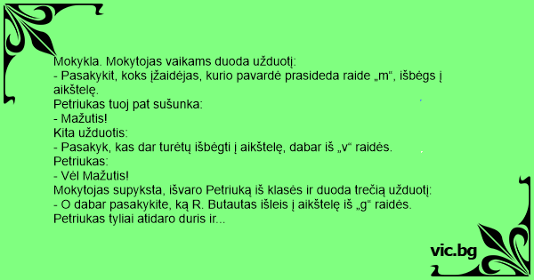 Mokytojas supyksta, išvaro Petriuką iš klasės ir duoda trečią užduotį: