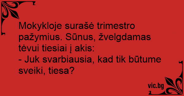 Mokykloje surašė trimestro pažymius. Sūnus, žvelgdamas tėvui tiesiai į akis: