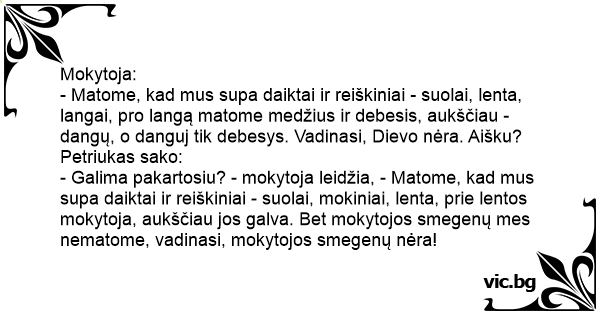 - Galima pakartosiu? - mokytoja leidžia, - Matome, kad mus supa daiktai ir reiškiniai - suolai, mokiniai, lenta, prie lentos mokytoja, aukščiau jos galva. Bet mokytojos smegenų mes nematome, vadinasi, mokytojos smegenų nėra!