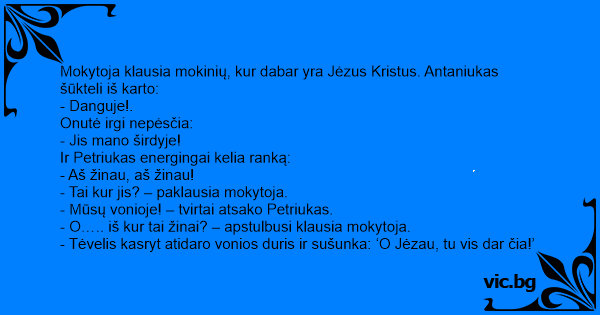 Mokytoja klausia mokinių, kur dabar yra Jėzus Kristus. Antaniukas šūkteli iš karto: