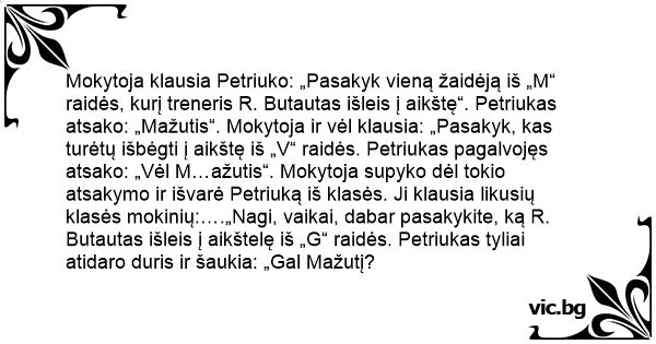 Mokytoja klausia Petriuko: „Pasakyk vieną žaidėją iš „M“ raidės, kurį treneris R. Butautas išleis į aikštę“. Petriukas atsako: „Mažutis“. Mokytoja ir vėl klausia: „Pasakyk, kas turėtų išbėgti į aikštę iš „V“ raidės. Petriukas pagalvojęs atsako: „Vėl M…ažutis“. Mokytoja supyko dėl tokio atsakymo ir išvarė Petriuką iš klasės. Ji klausia likusių klasės mokinių:….„Nagi, vaikai, dabar pasakykite, ką R. Butautas išleis į aikštelę iš „G“ raidės. Petriukas tyliai atidaro duris ir šaukia: „Gal Mažutį?