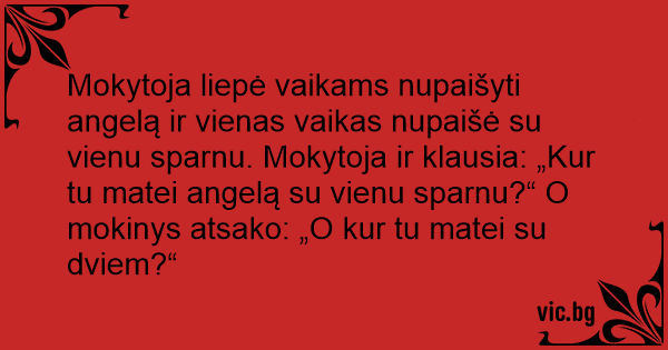 Mokytoja liepė vaikams nupaišyti angelą ir vienas vaikas nupaišė su vienu sparnu. Mokytoja ir klausia: „Kur tu matei angelą su vienu sparnu?“ O mokinys atsako: „O kur tu matei su dviem?“