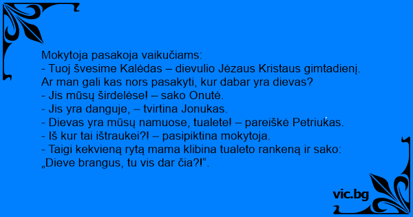 - Dievas yra mūsų namuose, tualete! – pareiškė Petriukas.