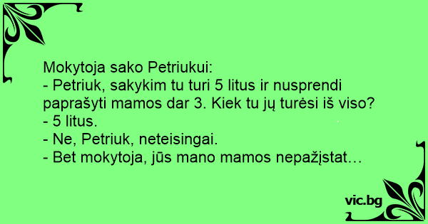 - Petriuk, sakykim tu turi 5 litus ir nusprendi paprašyti mamos dar 3. Kiek tu jų turėsi iš viso?