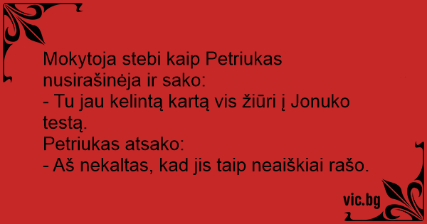 Mokytoja stebi kaip Petriukas nusirašinėja ir sako: