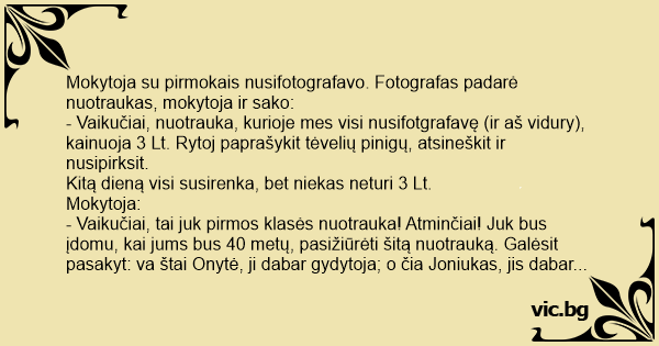 Mokytoja su pirmokais nusifotografavo. Fotografas padarė nuotraukas, mokytoja ir sako: