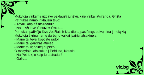 Mokytoja vaikams uždavė paklausti jų tėvų, kaip vaikai atsiranda. Grįžta Petriukas namo ir klausia tėvo: