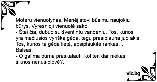 - Štai čia, dubuo su šventintu vandeniu. Tos, kurios yra mačiusios vyrišką gėdą, tegu prasiplauna juo akis. Tos, kurios tą gėdą lietė, apsiplaukite rankas…