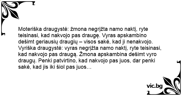 Vyriška draugystė: vyras negrįžta namo naktį, ryte teisinasi, kad nakvojo pas draugą. Žmona apskambina dešimt vyro draugų. Penki patvirtino, kad nakvojo pas juos, dar penki sakė, kad jis iki šiol pas juos…