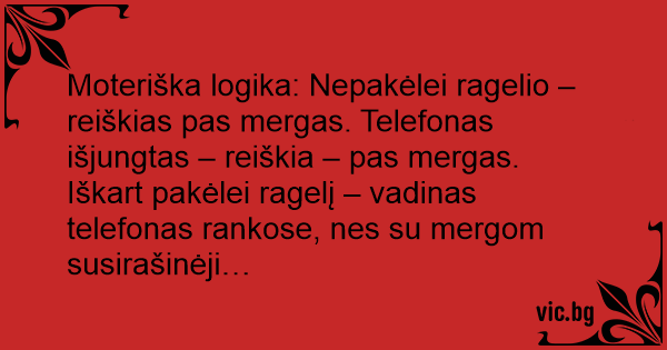Moteriška logika: Nepakėlei ragelio – reiškias pas mergas. Telefonas išjungtas – reiškia – pas mergas. Iškart pakėlei ragelį – vadinas telefonas rankose, nes su mergom susirašinėji…