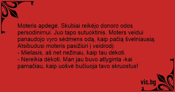 Moteris apdegė. Skubiai reikėjo donoro odos persodinimui. Juo tapo sutuoktinis. Moters veidui panaudojo vyro sėdmens odą, kaip pačią švelniausią. Atsibudusi moteris pasižiūri į veidrodį: