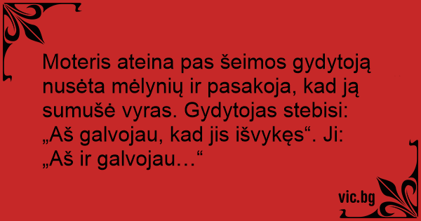 Moteris ateina pas šeimos gydytoją nusėta mėlynių ir pasakoja, kad ją sumušė vyras. Gydytojas stebisi: „Aš galvojau, kad jis išvykęs“. Ji: „Aš ir galvojau…“