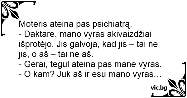 - Daktare, mano vyras akivaizdžiai išprotėjo. Jis galvoja, kad jis – tai ne jis, o aš – tai ne aš.