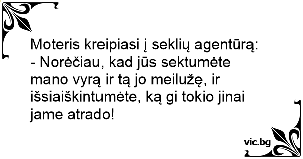 - Norėčiau, kad jūs sektumėte mano vyrą ir tą jo meilužę, ir išsiaiškintumėte, ką gi tokio jinai jame atrado!