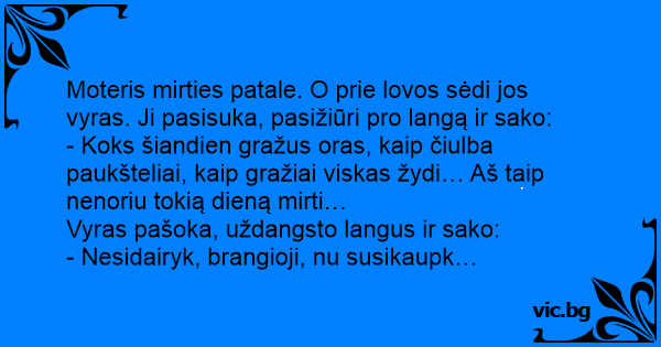 Moteris mirties patale. O prie lovos sėdi jos vyras. Ji pasisuka, pasižiūri pro langą ir sako: