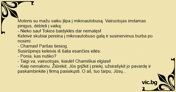 Το πιο άσχημο μωρό The baby Το άσχημο μωρό Една жена се качила в автобус с бебето си. Шофьорът казал: В автобусе едет женщина с ребёнком.Заходит пьяный мужик: A woman gets on a bus with her baby. The bus driver says, "That's the ugliest baby that I've ever seen. Ugh!" Uma mulher entra no ônibus com seu filho e o motorista se espanta:,- Nossa, é o bebê mais feio que já vi!,A mulher ouve calada e senta na parte de trás do ônibus. Bufando, desabafa para outro passageiro:,- O motorista me insultou!,E o passageiro recomenda:,- Vá lá... I was walking home last night when I noticed an old drunk staggering along the road. He passed a woman who was walking a young child. "Lady", said the drunk, "that's the ugliest kid I've ever seen. Damn, that is one ugly child!." As the drunk wandered off, the lady burst into tears. Just then,... Wchodzi kobieta z czarnym dzieckiem na rękach do autobusu. - Fuj, jakie brzydkie dziecko - mówi kierowca autobusu. Kobieta oburzona, ba, wpieniona na maksa siada obok innego pasażera i mówi: - Słyszał pan? Jak tak można. Jaki niekulturalny, jaka... Kommt eine Frau mit ihrem Kind auf dem Arm in den Bus. Sagt der Busfahrer: "Mensch sie haben aber ein häßliches Kind!" Schockiert und immer noch verärgert setzt sich die Frau in den Bus. Ihr... På en buss i London satt en ung kvinna med sin baby i famnen när en berusad man klev på och stannade framför henne. Mannen tittade en lång stund på barnet och sa sedan så högt att alla i bussen... Met haar baby van zes dagen op de arm stapt Annie de bus in. "Dat is de lelijkste baby die ik ooit heb gezien!" zei de chauffeur, waarop Annie woedend achter in de bus plaatsneemt. De man naast... Annie stapt de bus in met haar pasgeboren baby op haar arm. Zegt de buschauffeur: 'Tering! Zo'n lelijk kind heb ik nog nooit gezien!' Annie wordt boos en gaat helemaal achterin de bus zitten. Een... En dame går på en buss med babyen sin. Bussjåføren sier: - Det er den styggeste babyen jeg noen gang har sett. Æsj!. Dama finner seg et sete og setter seg ned, mens hun furter. Hun snur seg til... O femeie cu un copil in brate se urca in autobuz. Soferul Zice: - Aoleu, asta e cel mai urit copil pe care l-am vazut Vreodata. Femeia Se duce in spatele autobuzului si se asaza pe scaun, Spumegind... Een vrouw staat samen met haar baby op de arm te wachten bij een bushalte. Als de bus aan komt en de vrouw instapt zegt de buschauffeur: "Dat is de lelijkste baby die ik ooit heb gezien!" De vrouw... En dame går på bussen med babyen sin, da bussjåføren utbryter: - «Det er den styggeste babyen jeg noen gang har sett. Æsj!» Damen går bak i bussen, setter seg ned og er rasende. «Sjåføren fornærmet... A woman got on a bus holding a baby. The bus driver looked at the child and blurted out, "That's the ugliest baby I've ever seen!" Infuriated, the woman slammed her fare into the fare box and took... Kadın bebeğiyle otobüse binerken otobüs şöförü kendini tutamayıp şöyle demiş: - Aman tanrım ne kadar çirkin bir bebek... Kadın sinirle biletini kutuya basmış, en arka tarafa geçmiş, bir adamın... A lady boards the bus with her baby. The bus driver looks at the baby and says "that's the ugliest thing I've ever seen!" The lady finds a seat and she is mad as hell. She tells the guy in the seat... A woman walks onto the Bus with his child. The driver says, "That’s the ugliest child I have seen!" The woman sits down and tells her neighbor. The neighbor replies, “Go say something back. Here,... Uma Senhora estava sentada com o seu filhinho no colo, na poltrona do ônibus, quando chegou um cavalheiro e sentou ao lado dela, quando ele olhou para a criança, ficou espantado e falou: "Virgem... En kvinde kommer ind i en bus med en baby på armen... Chaufføren kigger længe på ungen og udbryder: "Hold da kæft en grim unge" Kvinden sætter sig bagest i bussen, mens hun er ved at koge over af...