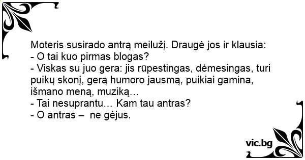 Moteris susirado antrą meilužį. Draugė jos ir klausia: