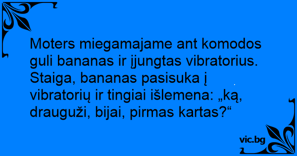 Moters miegamajame ant komodos guli bananas ir įjungtas vibratorius. Staiga, bananas pasisuka į vibratorių ir tingiai išlemena: „ką, drauguži, bijai, pirmas kartas?“