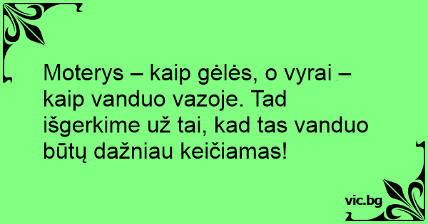 Moterys – kaip gėlės, o vyrai – kaip vanduo vazoje. Tad išgerkime už tai, kad tas vanduo būtų dažniau keičiamas!