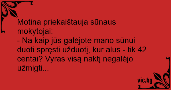 - Na kaip jūs galėjote mano sūnui duoti spręsti užduotį, kur alus - tik 42 centai? Vyras visą naktį negalėjo užmigti...