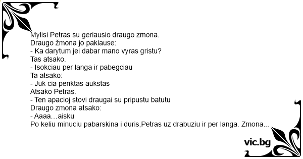 Po keliu minuciu pabarskina i duris,Petras uz drabuziu ir per langa. Zmona susitvarko ir nueina prie duru atidaro,o ten Petro draugai.