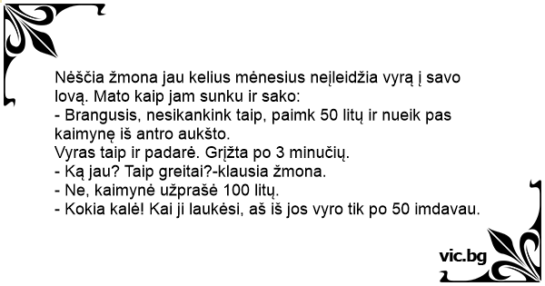 - Kokia kalė! Kai ji laukėsi, aš iš jos vyro tik po 50 imdavau.