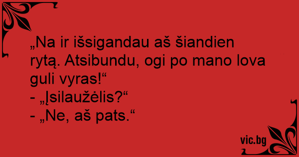 „Na ir išsigandau aš šiandien rytą. Atsibundu, ogi po mano lova guli vyras!“
