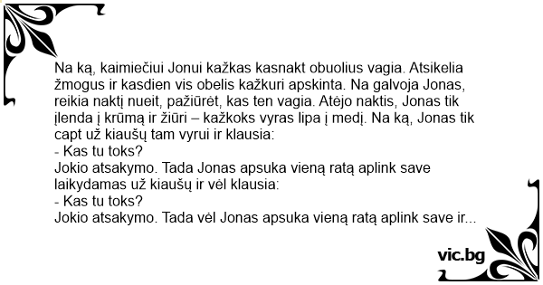 Jokio atsakymo. Tada Jonas apsuka vieną ratą aplink save laikydamas už kiaušų ir vėl klausia:
