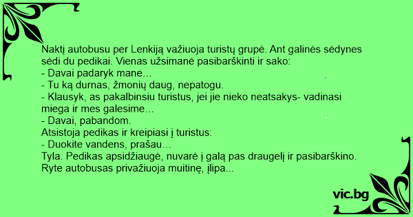 Tyla. Pedikas apsidžiaugė, nuvarė į galą pas draugelį ir pasibarškino. Ryte autobusas privažiuoja muitinę, įlipa muitininkas ir mato: sėdi perbalęs vairuotojas ir maldaujamu žvilgsniu prašo: