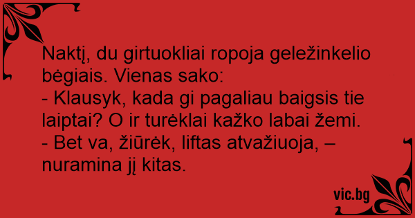 Idu dva ludaka prugom: - Ovo stepenište je baš dugačko.-kaže prvi. - Nema veze, stiže lift.-odgovori drugi