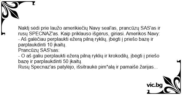 Naktį sėdi prie laužo amerikiečių Navy seal'as, prancūzų SAS'as ir rusų SPECNAZ'as. Kaip priklauso išgėrus, giriasi. Amerikos Navy: